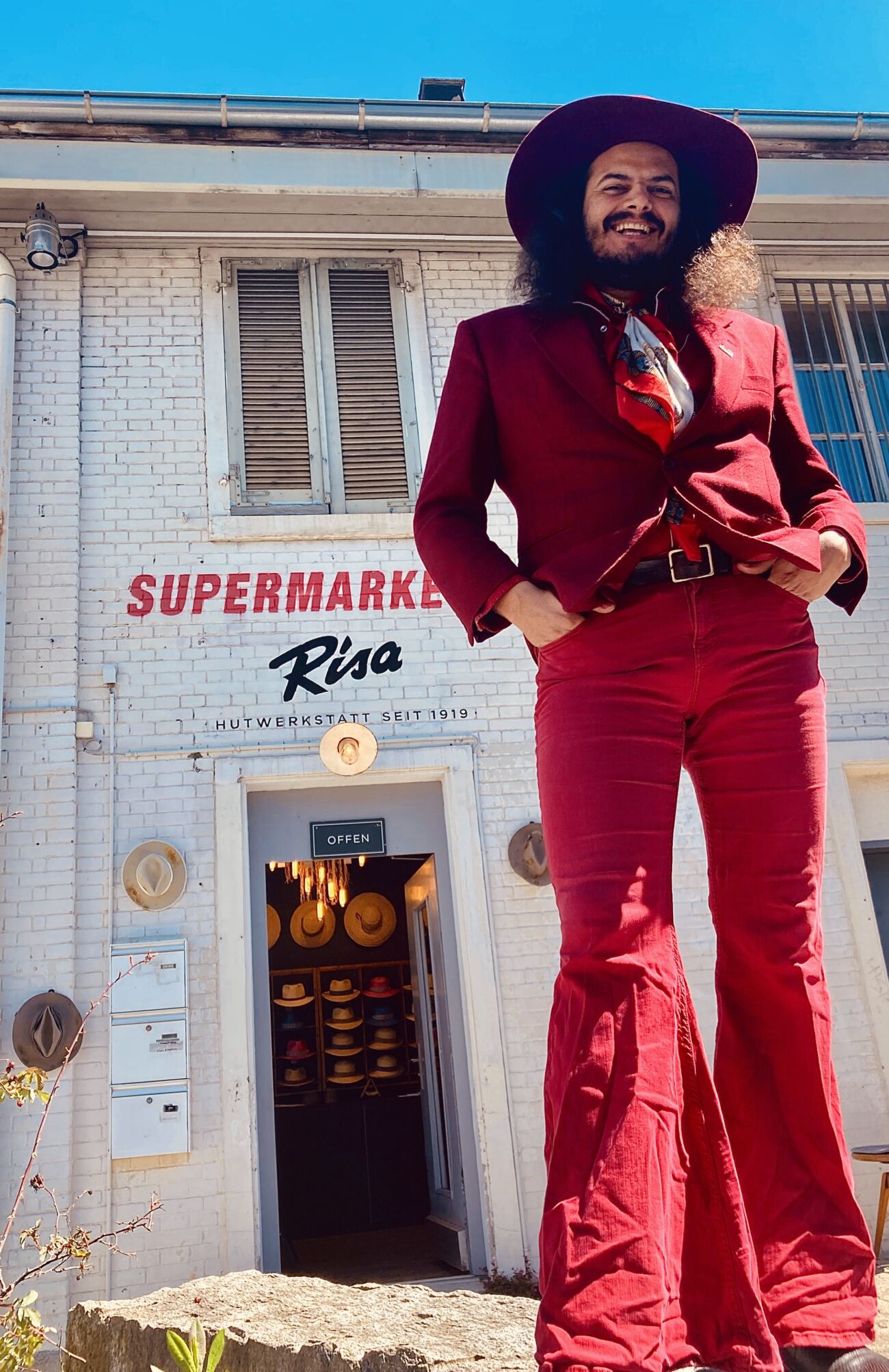 In der Geroldstrasse, die mit einem Vintage Fotoautomaten beginnt und in einem Viadukt endet, befindet sich ein kultiger Hutladen, voller Risa-Hüte aus Häggligen. Als ich den Laden betrete, fühle ich mich in eine andere Welt versetzt. Nicolas Streichenberg, ganz der Verkäufer, begrüsst mich herzlich. Der Musiker, der sich als Yes It’s Ananias der «psychoautomatischen» Pianoimpro visation verschrieben hat, ist seit drei Tagen von seiner MexikoTour zurück. Von Kopf bis Fuss steckt er in einem knallig roten Outfit und fällt damit im grauen Grossstadt gemisch etwas mehr auf. Heute schaue ich ihm im Laden über die Schulter, seit 2016 ist er hier im Einsatz.