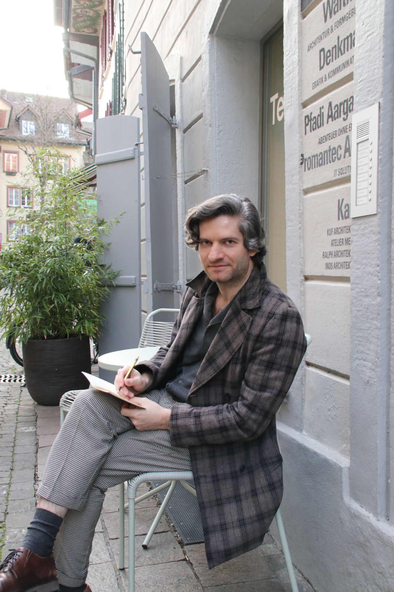 Es ist noch hell genug, um Bilder zu machen. Deswegen entscheide ich mich, während ich auf einer Bank sitze und auf meinen Gesprächspartner warte, das Fotoshooting zeitlich dem Gespräch vorzuziehen. Ich zweifle zwar, ob das eine gute Idee ist. Denn es bedarf eines Vertrauensverhältnisses zwischen Model und Fotografin, um einer krampfigen Stimmung vorzubeugen. So jedenfalls meine Erfahrung. Aber es ist, wie es ist. Hier, an unserem Treffpunkt, können wir sowieso nicht bleiben, wollen wir uns an der Wärme unterhalten – Dienstag ist Ruhetag und die Bar geschlossen. Der Ortswechsel bietet sich also an, auch gleich Bilder zu machen. Kaum denke ich das, taucht Alexander Estis auf. Er lächelt freundlich. «Endlich hat’s geklappt», sagen wir beide. Alexander ist viel im In- und Ausland unterwegs: Auf Lesereise und an Buchmessen, oder er gibt Kurse über literarisches Schreiben an Schulen und Universitäten und stellt sich TV- und Radio-Interviews. Als jüdischer Deutsch-Russe ist er ein gefragter Mann, wenn es, wie so oft im Moment, um Russland oder Antisemitismus geht. Dabei ist das Kommentieren von tagesaktuellen Ereignissen eher nicht seine Domäne. Seit dem Russland-Krieg allerdings könne er nicht anders, sagt er. «Ich betrachte mich nicht als Experte – weil ich ja nicht wissenschaftlich dazu forsche. Aber ich bin ein Autor, der sich zu Themen äussert, die ihn direkt betreffen. Wichtigster Punkt in diesem Zusammenhang ist, dass ich meine eigenen Überzeugungen regelmässig hinterfrage.» Seine meiste schöpferische Zeit widmet er allerdings dem Schreiben satirischer Kurztexte – zum Beispiel Glossen und Aphorismen. «Es gibt kaum Texte von mir ohne Ironie. Mal kippt die Erzählung ins Komische, mal ins Tragische.» Wobei er – so sagt er – keine zu starre Grenze zwischen Journalismus und Kunst ziehen wolle. Wir sind schon mitten im Gespräch, als wir in eine hübsche Gasse biegen. Sie ist menschenleer, perfekt für unsere Bilder. Alexander macht es mir sehr einfach. Er spielt Model, als ob er nie etwas anderes gemacht hätte. Ich, als Frau der Worte und nicht der Taten, bin ihm dankbar.