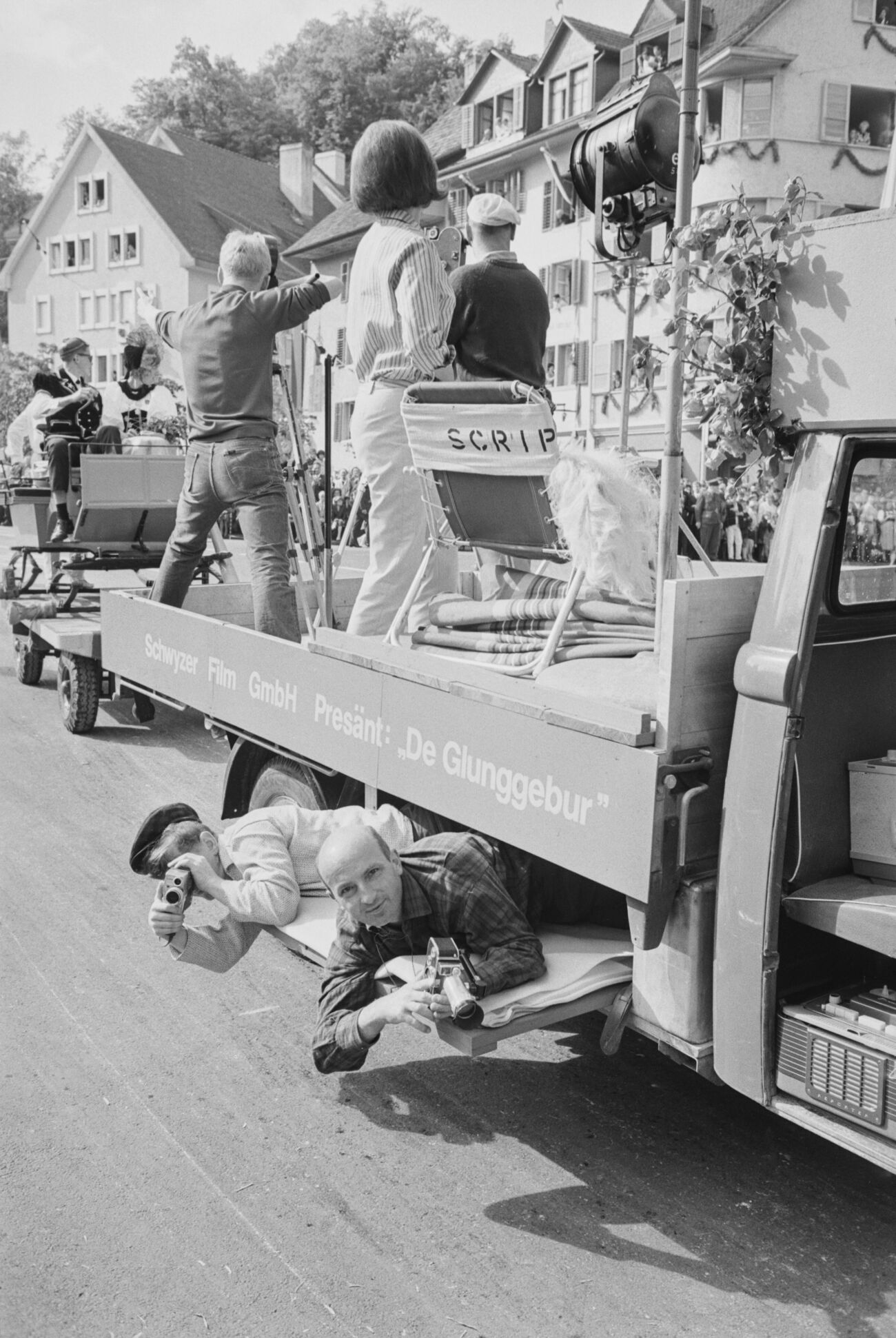 «Räder machen Leute» hiess das Motto der Badenfahrt 1967 und auch der Corso stand ganz im Zeichen der Fahrzeuge: Zahlreiche historische, fantasievolle, motorisierte und muskelbetriebene Kreationen rollten durch die Stadt. Mittendrin ein Fahrzeug, welches eigentlich gar nicht mit den prächtigen Umzugsattraktionen mithalten wollte, aber trotzdem nicht minder spektakulär war. Die Reporter*innen fuhren mit ihrem Aufnahmewagen mitten im Umzug mit und scheuten keinen Aufwand, die Umzugsparade aus allen Blickwinkeln festzuhalten.