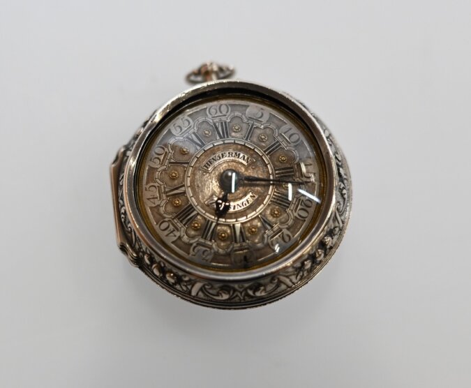 Taschenuhr von Friedrich Häusermann (1677 – 1739), Zofingen, um 1690, silbernes Gehäuse, Teile vergoldet, Durchmesser (Gehäuse): 5,0 cm, Sammlung Museum Aargau, Inv.-Nr. K-11455.