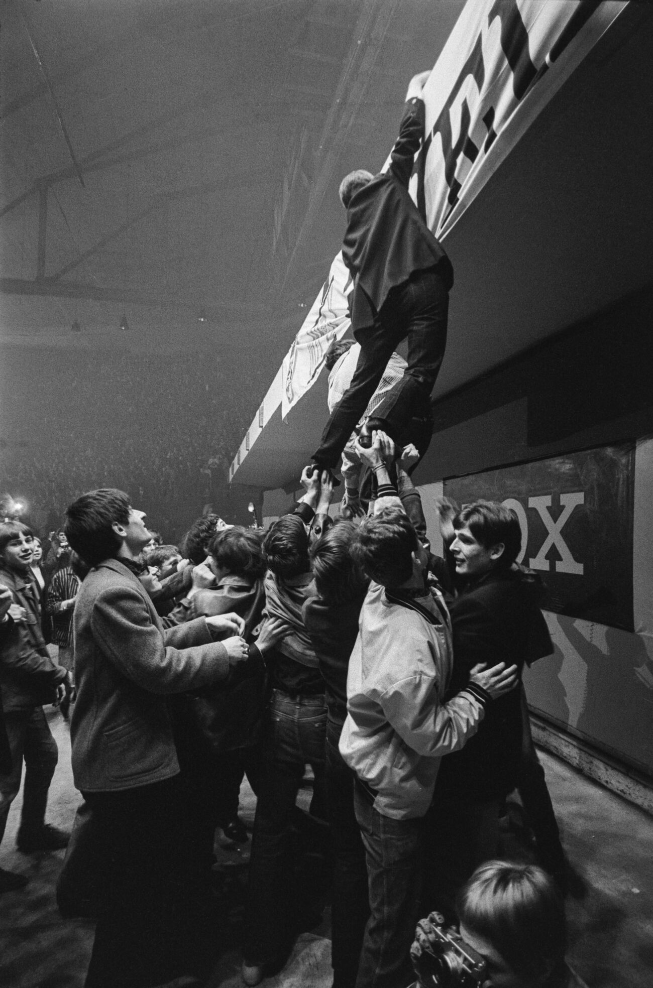 Fans versuchen die Bühne im Hallenstadion zu erklimmen.
