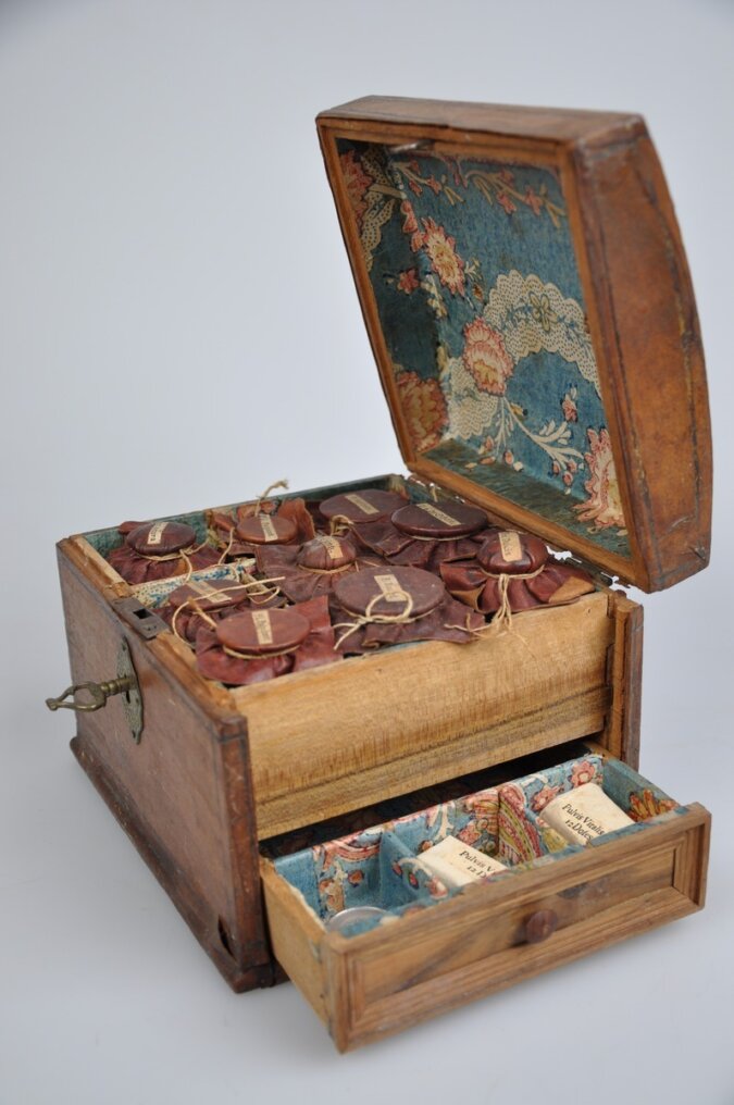 Ein Stück Sicherheit für unterwegs: Reiseapotheke, Anfang 18. Jh., Holz, Leder, Glas, Papier, Siegelwachs, 14 cm × 18 cm × 17 cm, Sammlung Museum Aargau, Inv.-Nr. K-940