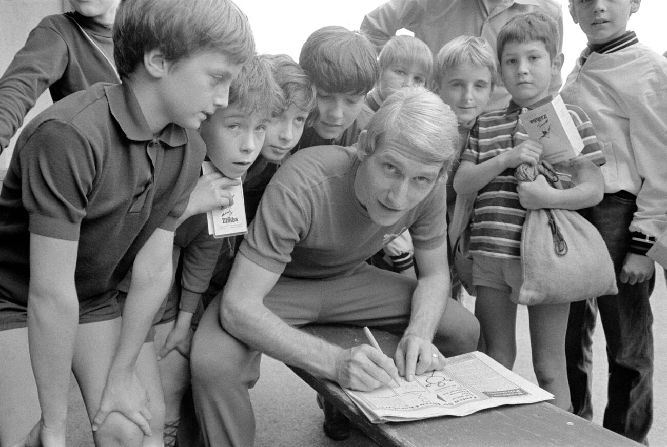 Fussballer Karl Odermatt mit Fans, März 1969. Foto: Urs Grassi © StAAG/RBA3-2-BL002862_1