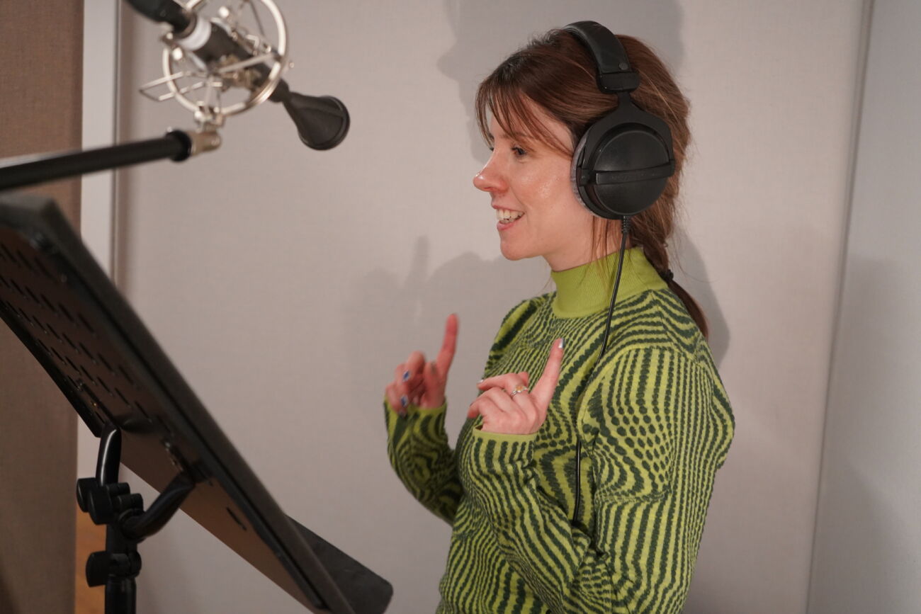 Anna Schiestl bei Aufnahmen im Podcast-Studio.
