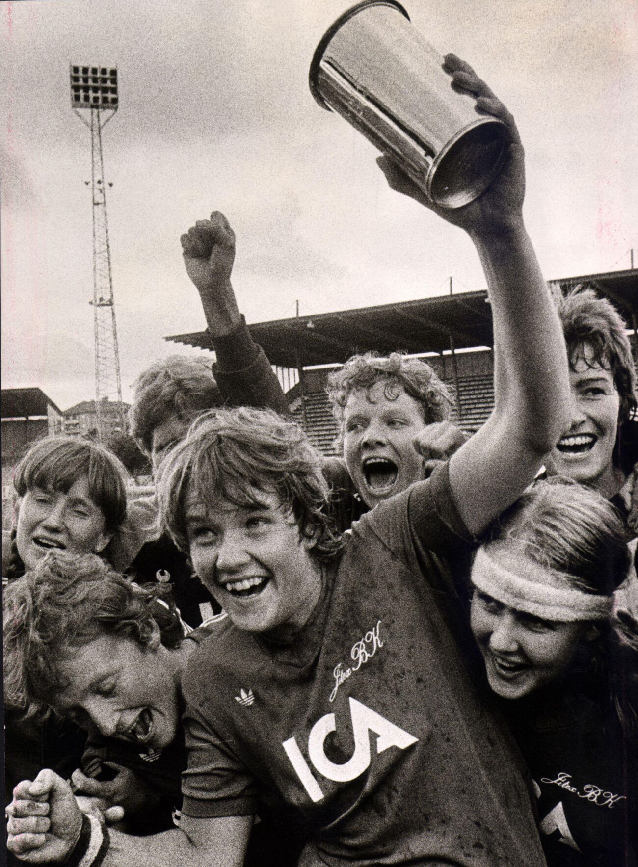 Pia Sundhage, nachdem sie mit ihrem Klub Jitex den schwedischen Pokal gewonnen hatte 1981.