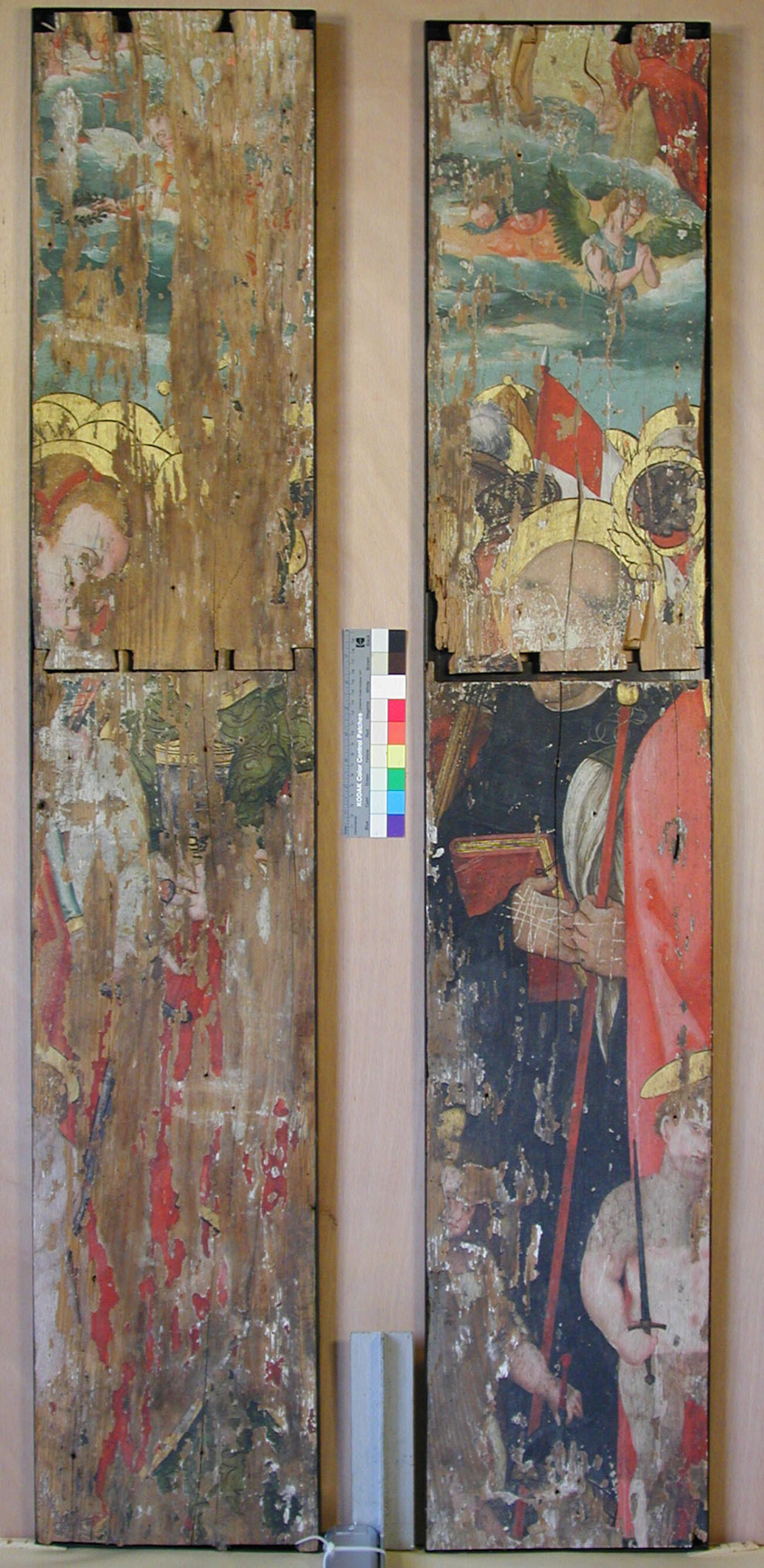 Die erste Tafel (links auf der Abb.) zeigt am linken Rand eine vor einer Heiligenschar stehende Frauengestalt mit rotem Haarband und hellblonden Haaren. Sofern die Hand mit dem Schwert zur Figur gehört, liegt die Vermutung nahe, dass es sich um die Darstellung der heiligen Katharina handelt. In der Mitte derselben Tafel ist eine Figur mit einem Kelch zu erkennen. Sie trägt eine grüne Dalmatika (Obergewand) mit goldenen Säumen, wobei darunter der rechte Ärmel der Alba (Untergewand) zu erkennen ist. Folglich handelt es sich wohl um einen heiligen Diakon, vermutlich Laurentius, Stephanus oder Vinzenz. Im oberen Bereich befindet sich ein Engel mit einem Kranz, der wohl als Märtyrerkrone zu deuten ist.