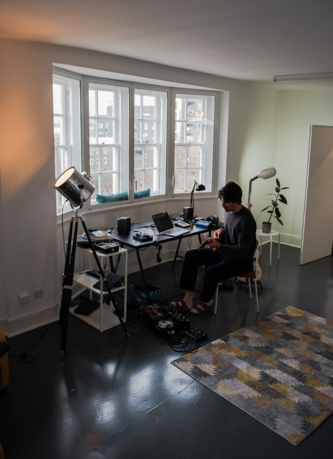 Es ist bald Halbzeit meiner Residenz in der Fire Station in East London. Ich sitze im etwa 50 Quadratmeter grossen Atelier, vor mir das Pedalboard, zwei E-Gitarren, ein Laptop, Kabel überall – und durch die grosse Fensterfront sehe ich die Skyline: den Shard, Canary Wharf, das pulsierende London.